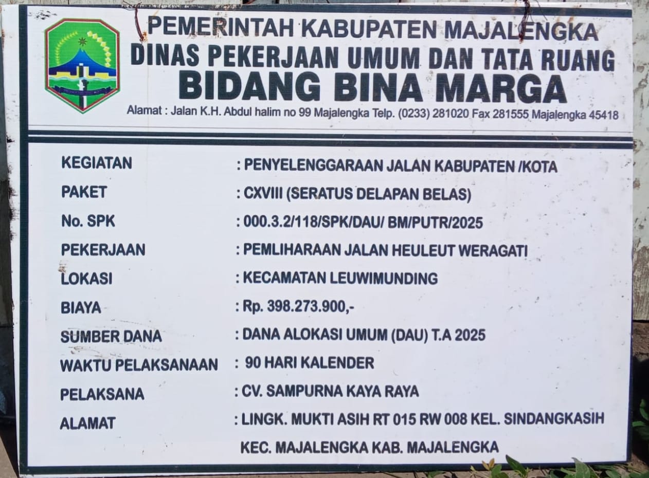 Berdasarkan papan informasi proyek segmen pekerjaan tersebut adalah: Penyelenggaraan jalan kabupaten/kota. Paket : CXVIII (SERATUS DELAPAN BELAS). Dengan Nomor SPK : 000.3.2/118/SPK/DAU/BM/PUTR/2025. Jenis Pekerjaan: Pemeliharaan Jalan Heuleut – Weragati. Lokasi : Kecamatan Leuwimunding. Dengan Biaya Anggaran: Rp. 398.273.900, Sumber Dana: Dana Alokasi Umum (DAU) T.A 2025. Dengan ketentuan waktu pelaksanaan: 90 Hari Kalender, Pelaksana Kegiatan : CV. SAMPURNA KARYA RAYA. Yang beralamat di jalan : LINGKUNGAN MUKTI ASIH RT. 015 RW. 008, KELURAHAN SINDANGKASIH, KECAMATAN MAJALENGKA, KABUPATEN MAJALENGKA JAWA BARAT