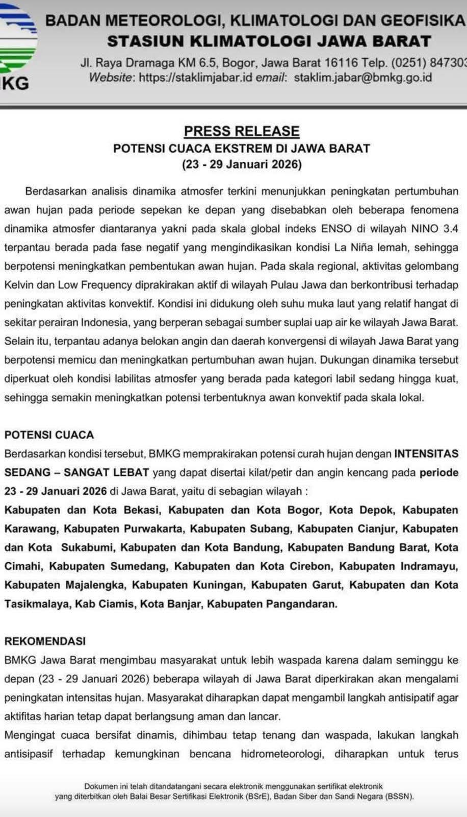 ELTV SATU ||| BOGOR – Badan Meteorologi, Klimatologi, dan Geofisika (BMKG) melalui Stasiun Klimatologi Jawa Barat mengeluarkan peringatan dini potensi cuaca ekstrem di sejumlah wilayah Jawa Barat pada periode 23 hingga 29 Januari 2026.