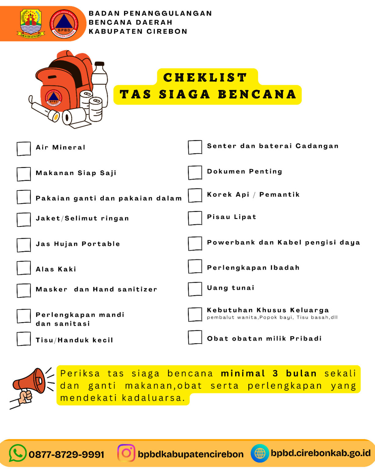 Dalam kondisi darurat, masyarakat dapat segera melapor ke BPBD Kabupaten Cirebon melalui layanan call center 112 atau pesan singkat WhatsApp di nomor 087787299991.