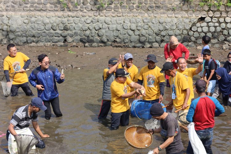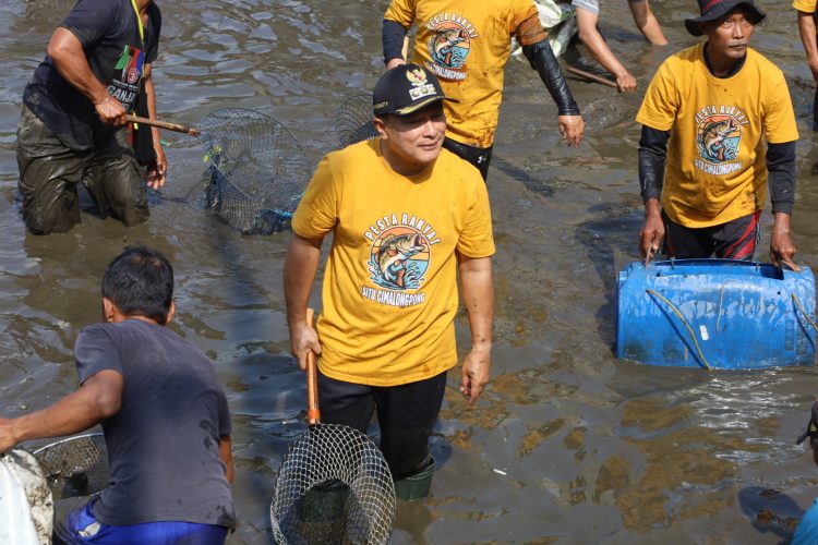 ELTV SATU ||| KUNINGAN – Tak hanya warga yang turun ke situ, Bupati Kuningan, Dr. H. Dian Rachmat Yanuar, M.Si., pun turut berbaur bersama warga menangkap ikan. Suasana penuh keceriaan berlangsung pada Panen Raya Ikan atau yang dikenal dengan tradisi “Ngobeng Lauk” di Situ Cimalongpong, Kelurahan Ciporang, Kecamatan Kuningan, Senin (20/10/2025).