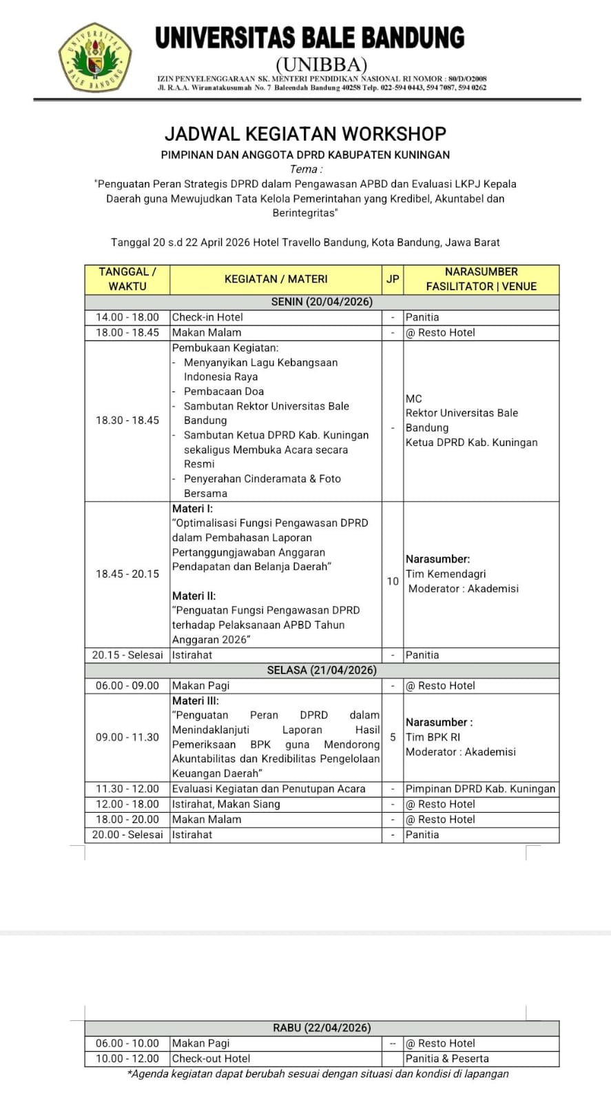 Sementara itu, kegiatan workshop mengusung tema penguatan peran strategis DPRD dalam pengawasan APBD dan evaluasi LKPJ kepala daerah. Agenda dimulai sejak Senin (20/4) dengan check-in peserta dan pembukaan resmi yang diisi sambutan dari Rektor Universitas Bale Bandung dan Ketua DPRD Kuningan.