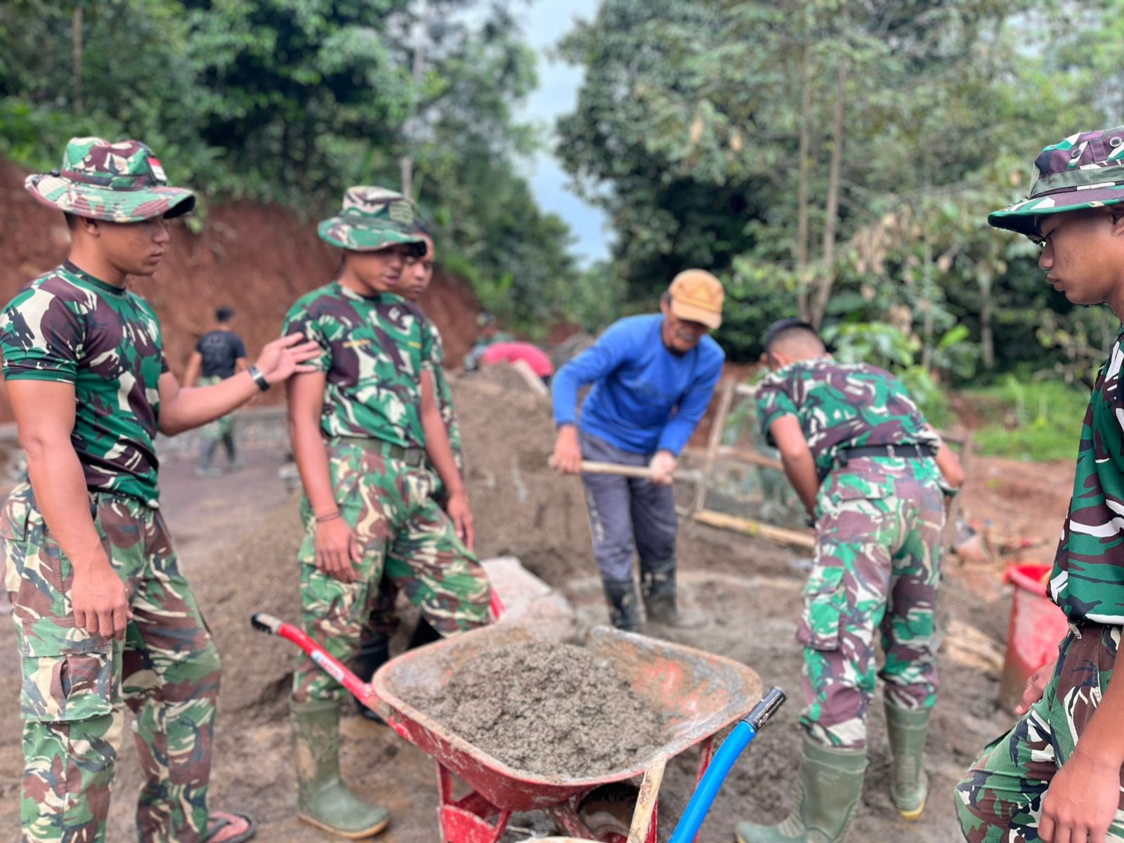 Kegiatan tersebut dilakukan secara gotong royong antara personel Satgas TMMD dan warga setempat demi mempercepat penyelesaian pembangunan infrastruktur desa yang menjadi sasaran program TMMD tahun ini.