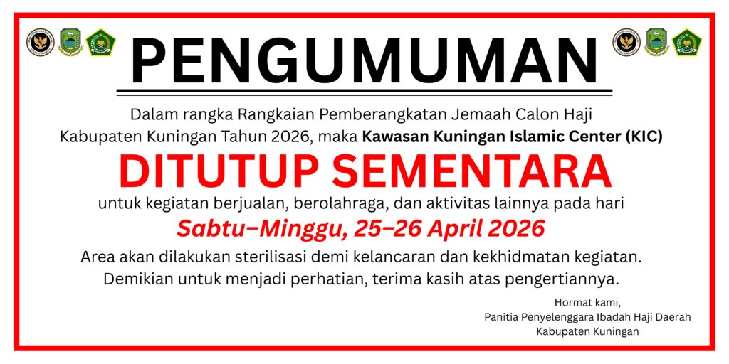 ELTV SATU || KUNINGAN — Sebanyak 690 calon jemaah haji (calhaj) asal Kabupaten Kuningan siap diberangkatkan ke Tanah Suci tahun 2026. Demi kelancaran proses tersebut, kawasan Kuningan Islamic Center (KIC) akan ditutup total selama dua hari, pada 25–26 April 2026.