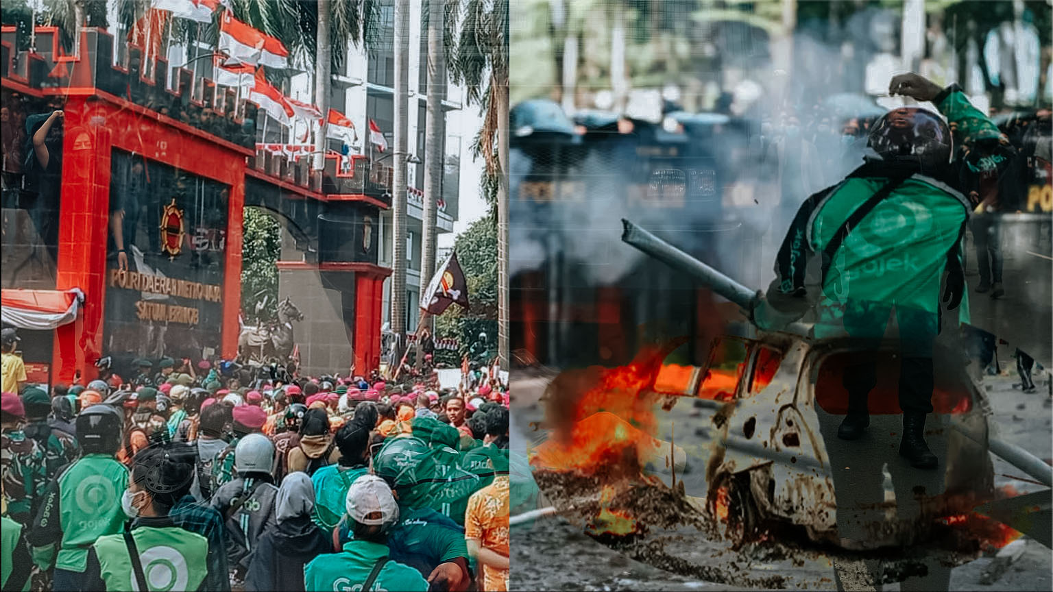 Ribuan ojol yang sejak pagi berdemo di depan Gedung DPR RI menolak kebijakan transportasi online mulai berhadap-hadapan dengan aparat. Dorong-mendorong terjadi, aparat menembakkan gas air mata untuk membubarkan massa.