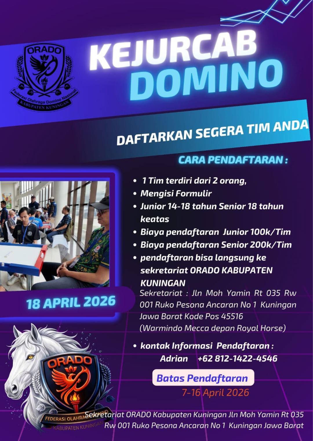 ELTV SATU ||| KUNINGAN — Federasi Olahraga Domino Nasional (ORADO) Kabupaten Kuningan akan menggelar Kejuaraan Cabang (Kejurcab) domino perdana pada Sabtu, 18 April 2026. Kegiatan ini menjadi tonggak awal pengembangan olahraga domino sebagai cabang kompetitif sekaligus momentum deklarasi kepengurusan ORADO di tingkat kabupaten.