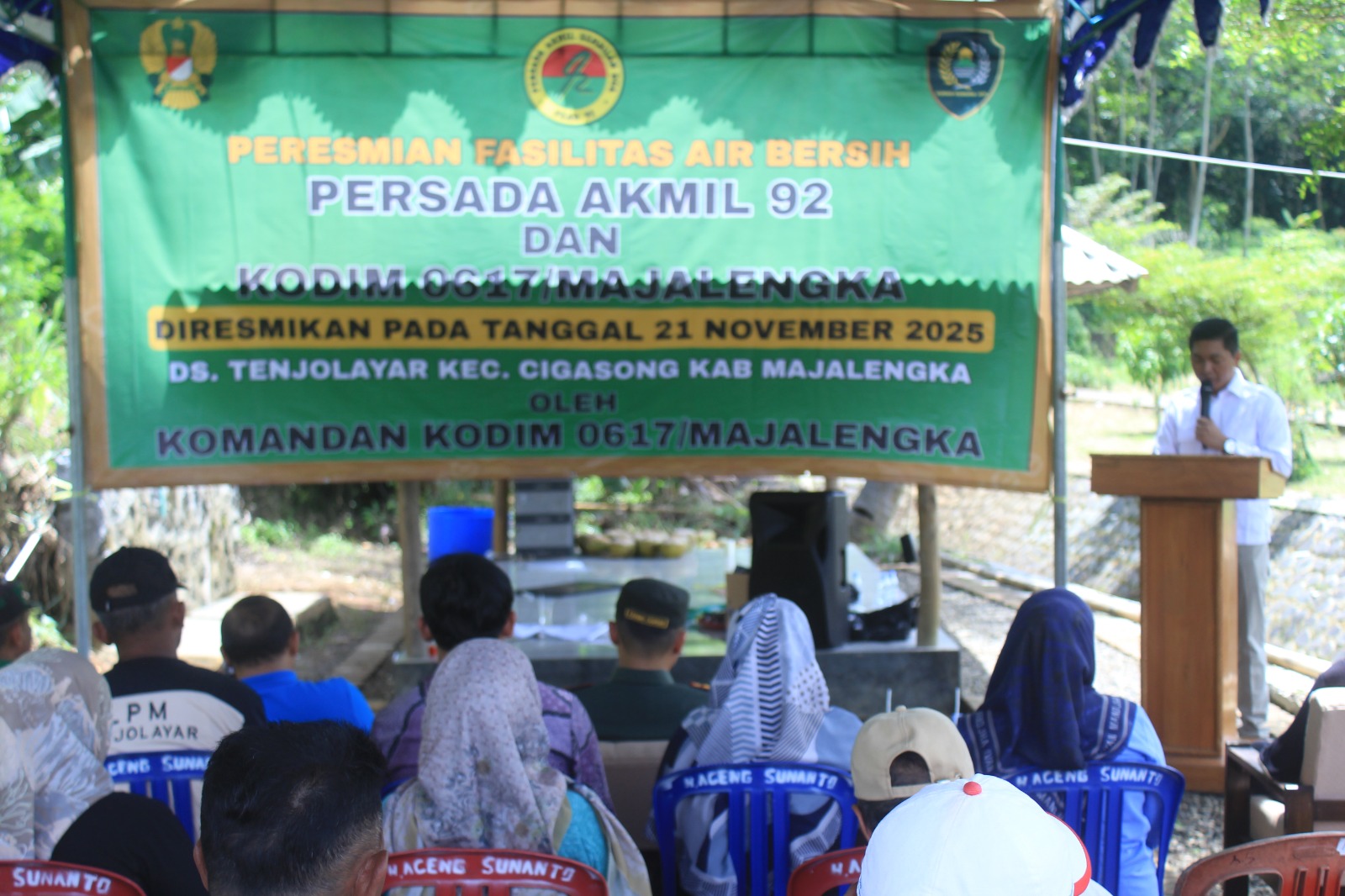 ELTV SATU ||| Majalengka – Persada Akmil 92 bersama Kodim 0617/Majalengka meresmikan fasilitas air bersih di Embung Sokalayar, Desa Tenjolayar, Kecamatan Cigasong, Majalengka, Jumat (21/11/2025). Peresmian dipimpin langsung Dandim 0617/Majalengka Letkol Inf Fahmi Guruh Rahayu.