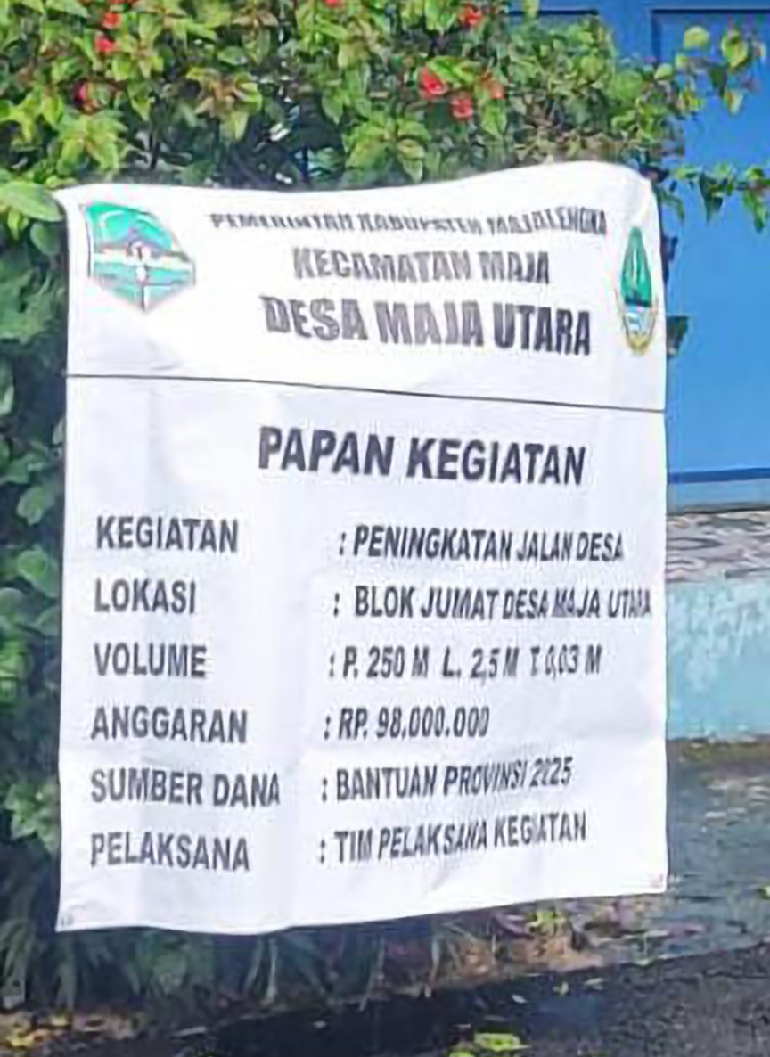 ELTV SATU ||| Majalengka — Pemerintah Kabupaten Majalengka melalui Kecamatan Maja dan Pemerintah Desa Maja Utara telah melaksanakan kegiatan *Peningkatan Jalan Desa* yang berlokasi di *Blok Jumat, Desa Maja Utara*. Kegiatan tersebut dibiayai dari *Bantuan Provinsi Tahun Anggaran 2025* dengan nilai anggaran sebesar *Rp98.000.000*.