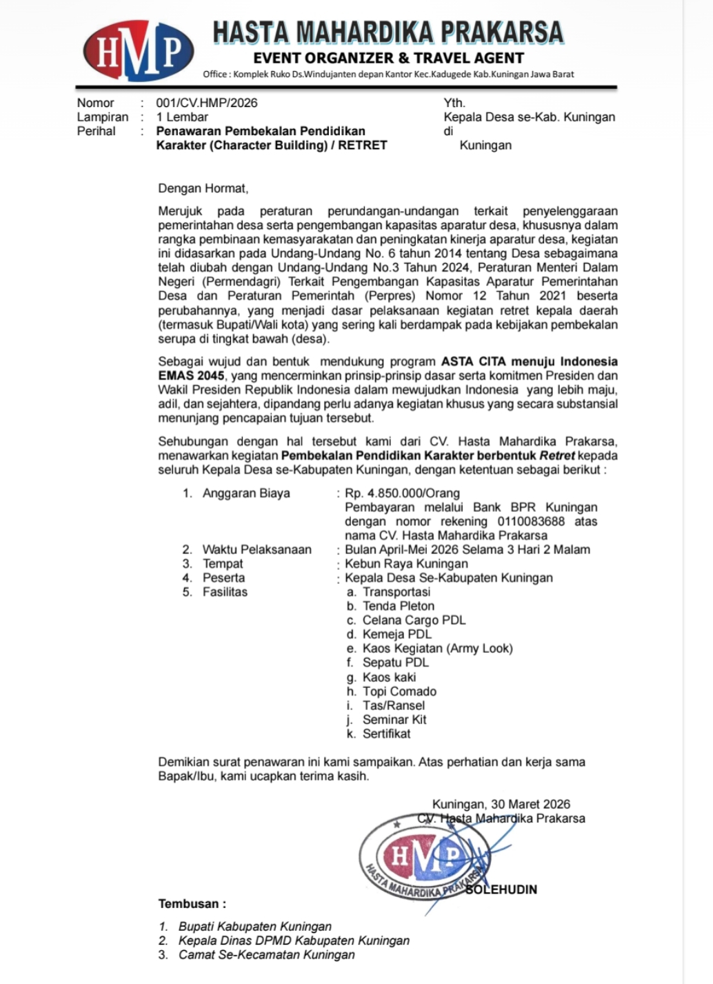 Program yang ditawarkan oleh CV Hasta Mahardika Prakarsa tersebut dijadwalkan berlangsung pada April hingga Mei 2026, selama tiga hari dua malam di Kebun Raya Kuningan. Peserta yang disasar meliputi Kepala Desa dan Ketua Badan Permusyawaratan Desa (BPD).