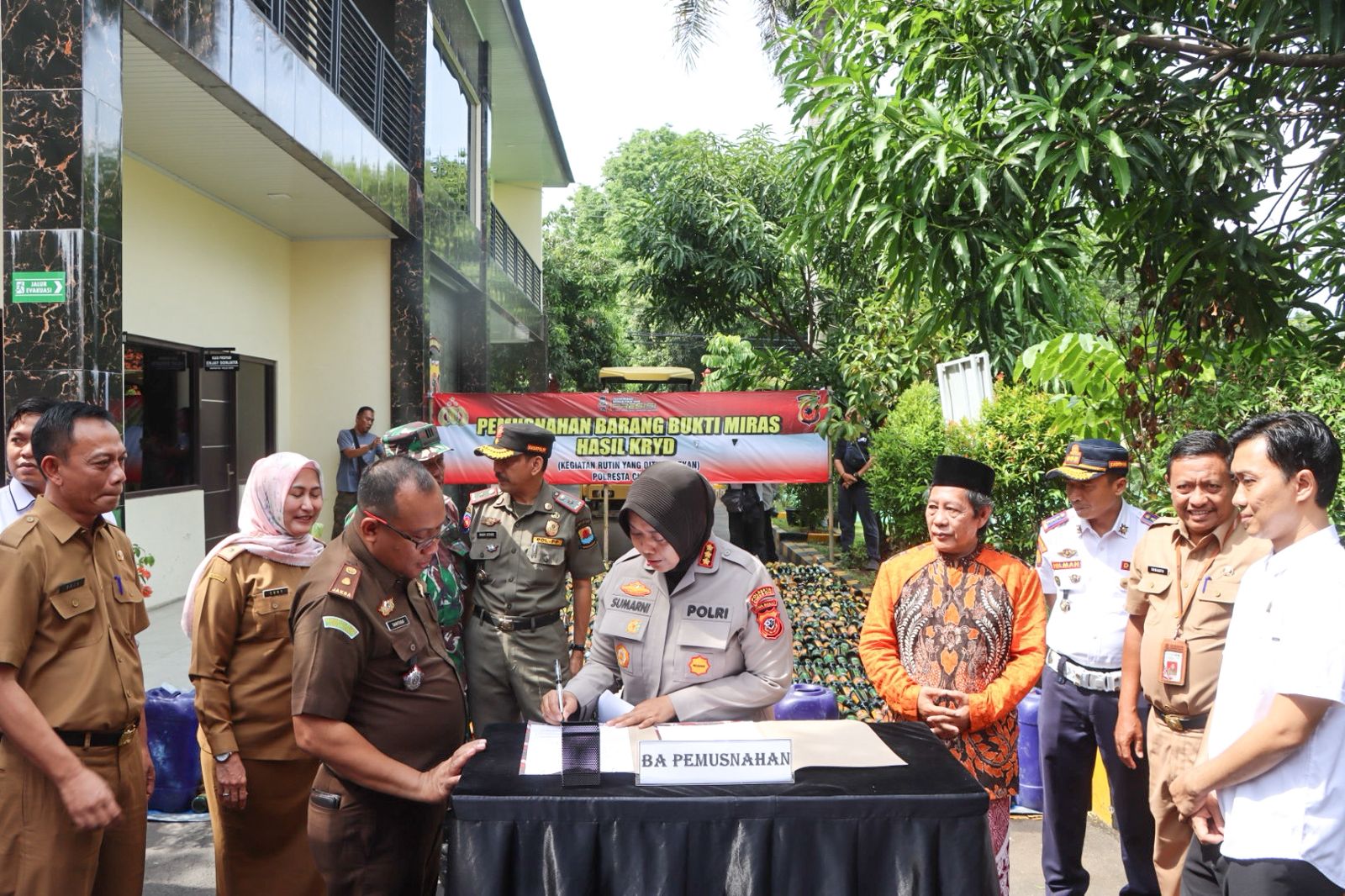 Adapun barang bukti yang dimusnahkan terdiri dari 1.980 botol miras pabrikan, 7.347 botol miras tradisional jenis ciu, 426 liter tuak, dan 2.560 knalpot tidak sesuai spesifikasi teknis.