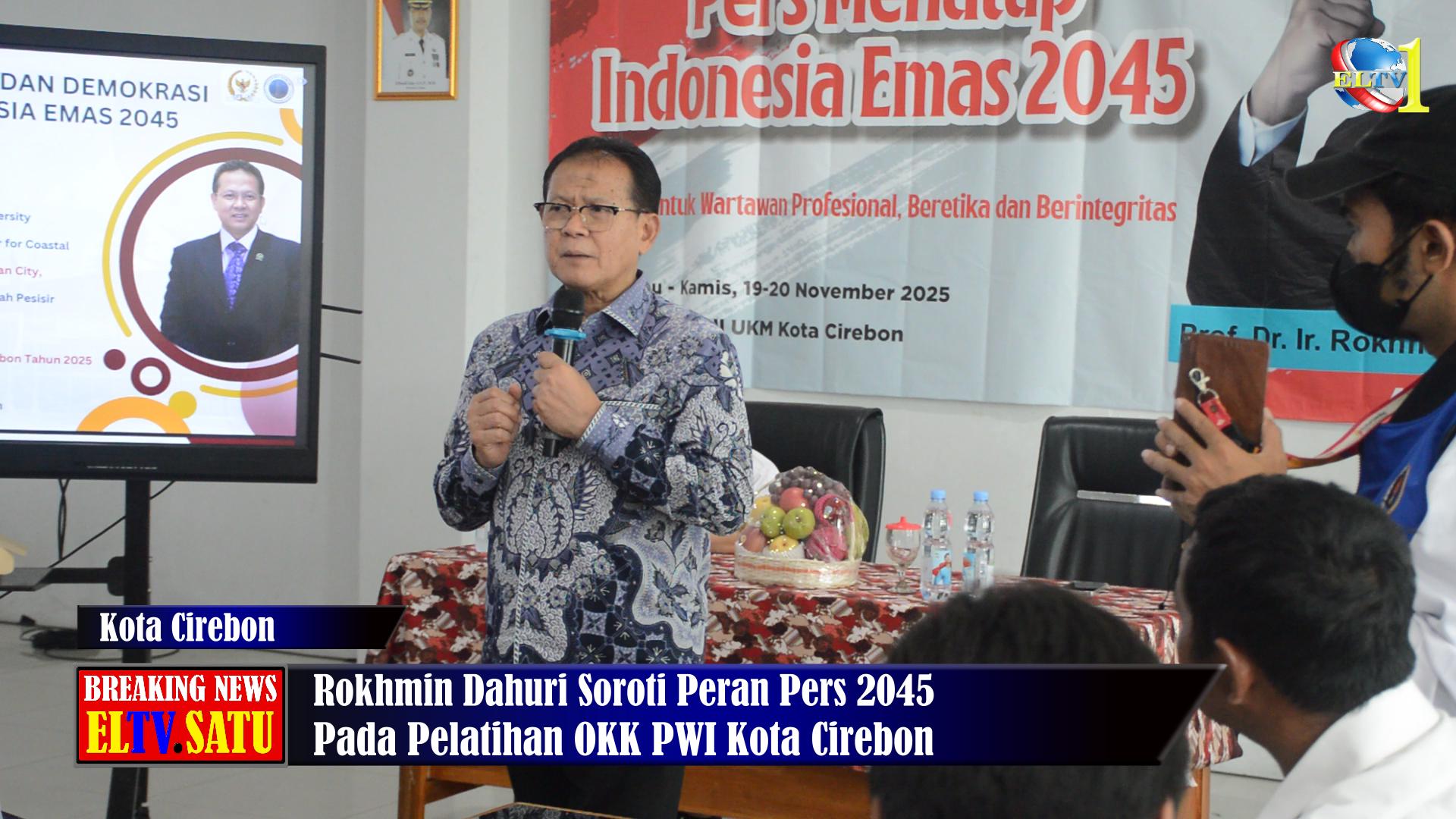 ELTV SATU ||| KOTA CIREBON  – PWI Kota Cirebon menggelar Pelatihan Jurnalistik dan OKK PWI 2025 hari pertama di Gedung Dinas Koperasi Usaha Kecil Menengah Perdagangan dan Perindustrian (DKUKMPP) Kota Cirebon, 19 November 2025. Materi utama bertema “Pers Menatap Indonesia Emas 2045” disampaikan oleh Prof. Rokhmin Dahuri, yang menekankan pentingnya peran pers sebagai penguat demokrasi, penyampai informasi, serta pemberi umpan balik bagi arah pembangunan nasional.