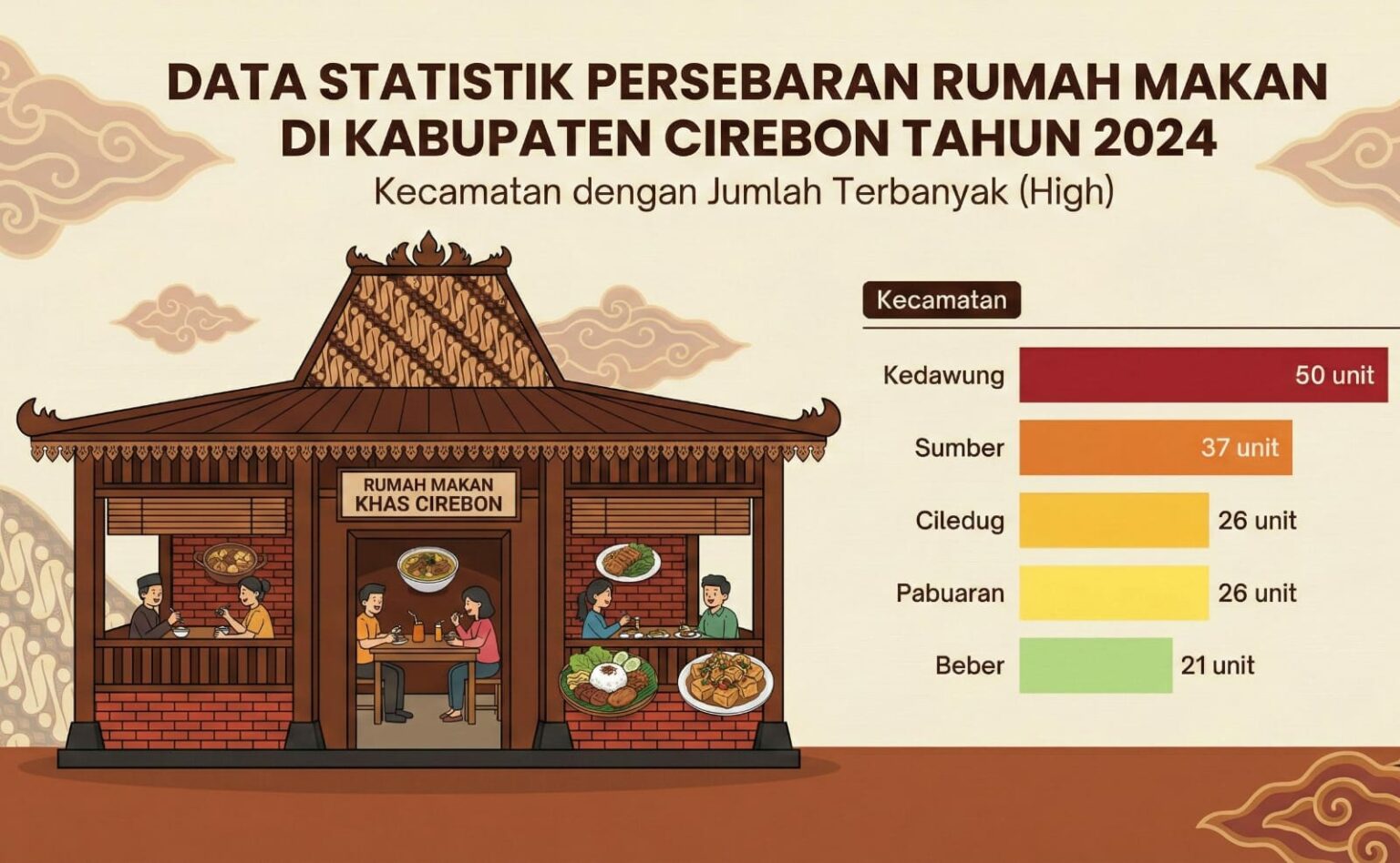 Kecamatan Kedawung tercatat sebagai wilayah dengan jumlah rumah makan terbanyak, mencapai 50 unit. Disusul Kecamatan Sumber dengan 37 unit rumah makan, sejalan dengan perannya sebagai pusat pemerintahan dan pelayanan publik di Kabupaten Cirebon. Tingginya aktivitas masyarakat di dua kecamatan tersebut dinilai menjadi faktor utama berkembangnya usaha kuliner.