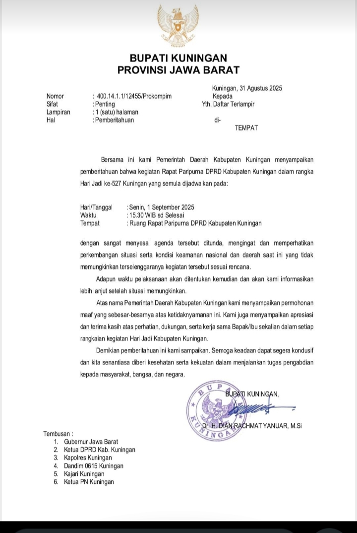 ELTV SATU ||| KUNINGAN – Pemerintah Kabupaten Kuningan bersama DPRD dan Forkopimda memutuskan untuk menunda pelaksanaan Sidang Paripurna Istimewa Hari Jadi Kuningan ke-527 yang semula dijadwalkan berlangsung pada Senin, 1 September 2025.
