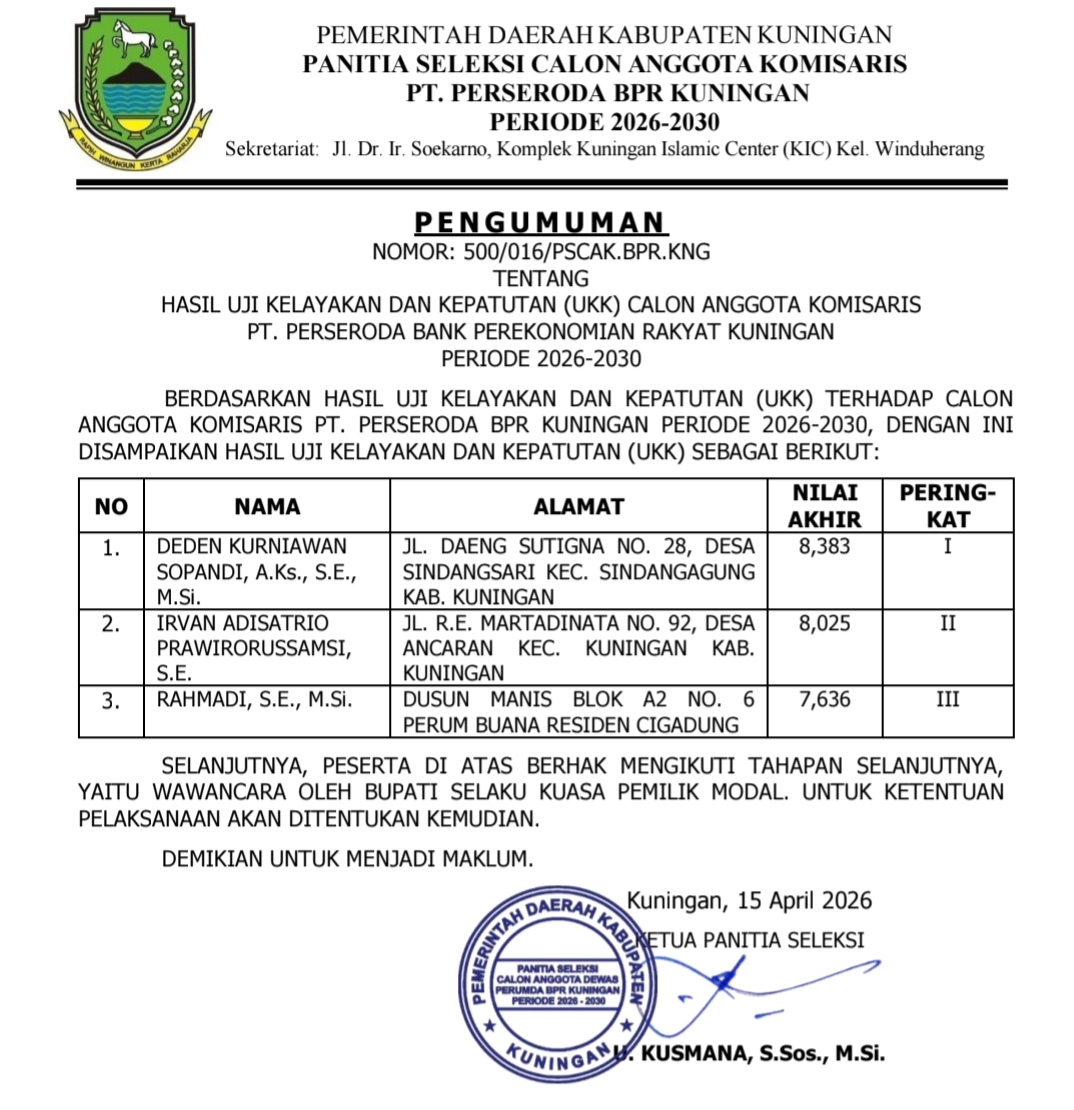 Pengumuman hasil UKK tersebut tertuang dalam surat Panitia Seleksi Nomor: 500/016/PSCAK.BPR.KNG tertanggal 15 April 2026.