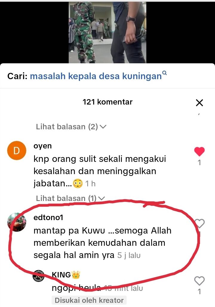 ELTV SATU ||| KUNINGAN – Komentar yang dilontarkan diduga oleh seorang oknum guru SMA 1 Jalaksana, berinisial S, di media sosial, memicu keprihatinan warga Desa Padamenak. Komentar tersebut muncul saat Rakiman menegaskan bahwa dirinya tidak akan mundur dari jabatan selaku Kepala Desa Padamenak, disertai ucapan singkat dari S, “Mantap Pak. Kuwu.”